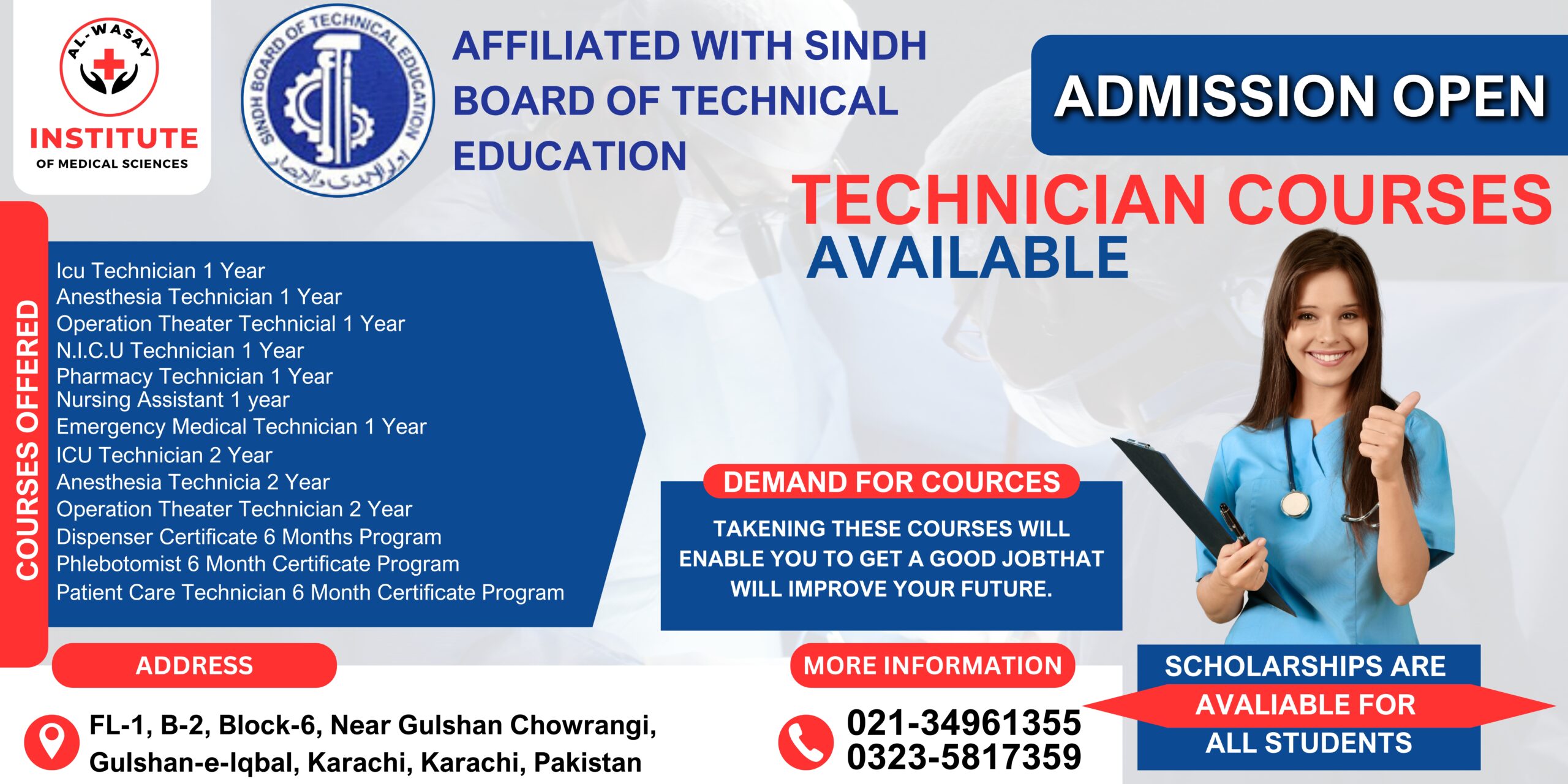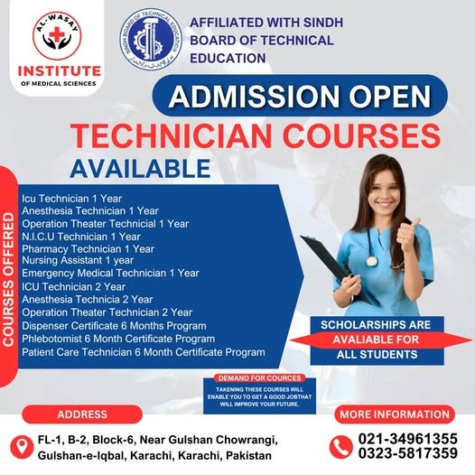Start your professional journey in the healthcare field with Al-Wasay Institute of Medical Sciences, affiliated with the Sindh Board of Technical Education . We offer top-rated medical technician courses in Karachi , including ICU Technician, Anesthesia Technician, Operation Theater Technician, Pharmacy Technician, and more. Each program is designed to give you practical training, hands-on experience, and the technical skills needed to succeed in hospitals, laboratories, and medical centers. Our qualified instructors and modern facilities ensure you get industry-standard education that opens doors to a stable and respected medical career.